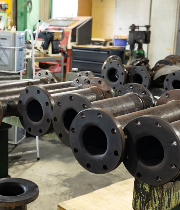 ゴムは熱と圧力によって加硫反応を起こします。当社は蒸気圧を利用して加硫反応を起こす為、金型が不要で画像のような大きな圧力容器内(=加硫缶)に前工程で行った仕掛の「ゴム巻き品」や「ゴムライニングのゴム貼り品」「ゴムスリーブ」などの多種多様な製品を一度に入れて加硫(焼付/ゴムライニング)を行うことが可能です。
