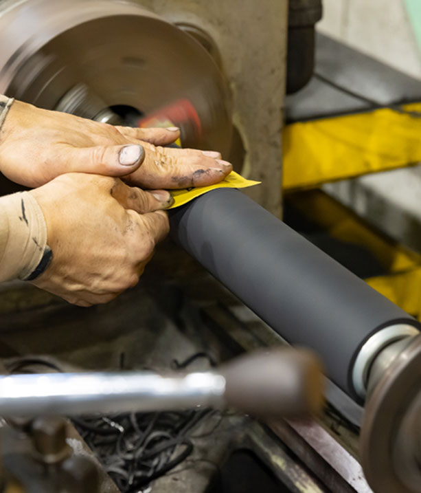 4気圧×90~120分の加硫条件+半日間程度の自然冷却を行い、加硫後(ゴムライニング/焼付)の仕上加工を行っていきます。ゴムローラーの場合は、旋盤による仕上加工。ゴムライニング品の場合は、図面指示に従いボール盤やサンダーによる美観仕上。ゴムスリーブ品の場合は、旋盤による仕上加工後、中型(中芯)からの取り外しを行い完成となります。